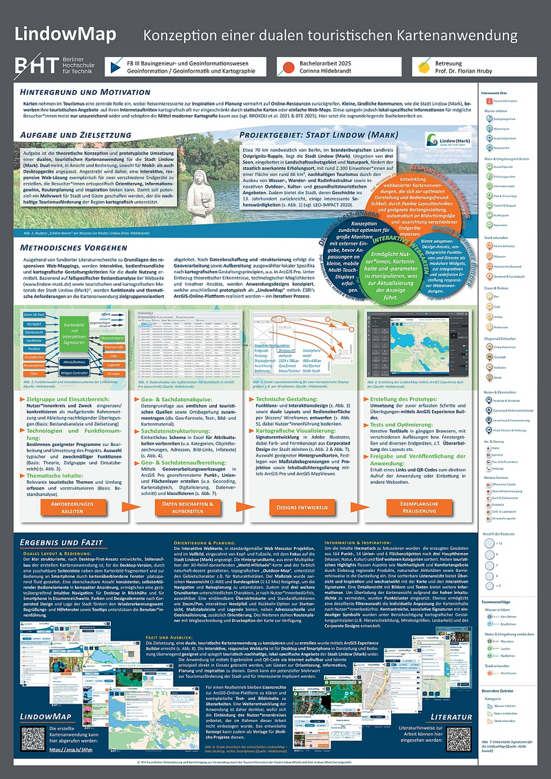 Karten nehmen im Tourismus eine zentrale Rolle ein, wobei Reiseinteressierte zur Inspiration und Planung vermehrt auf Online-Ressourcen zurückgreifen. Kleine, ländliche Kommunen, wie die Stadt Lindow (Mark), bewerben ihre touristischen Angebote auf ihren Internetauftritten kartografisch oft nur eingeschränkt durch statische Karten oder einfache Web-Maps. Diese spiegeln jedoch lokal-spezifische Informationen für mögliche Besucher*innen meist nur unzureichend wider und schöpfen die Mittel moderner Kartografie kaum aus (vgl. BROKOU et al. 2021 & BTE 2025).