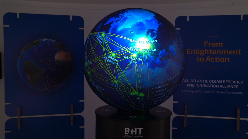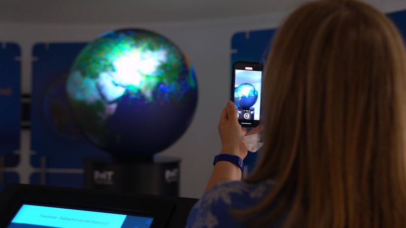 Über die Touch-Konsole hat das Publikum die Möglichkeit selbständig den Globus zu drehen, einzelne Stellen zu vergrößern (Fischauge), sich über Details zu einem Thema zu informieren und Ebenen zu de-/aktivieren.