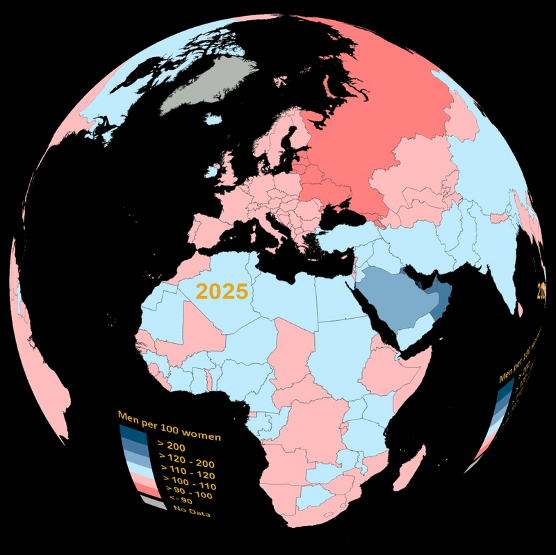 Diese Animation zeigt die Anzahl Männer pro 100 Frauen in der Bevölkerung eines Landes zwischen 1950 und 2050 bei einer mittleren Projektion für zukünftige Zeiträume.
